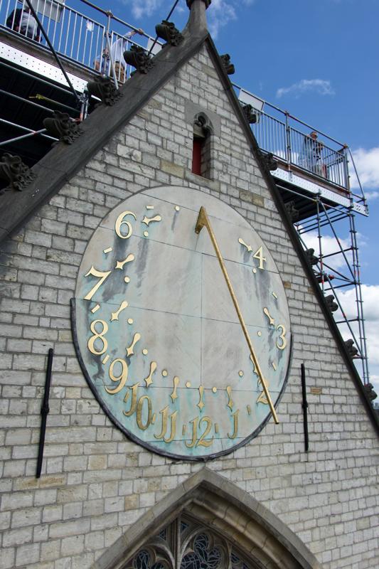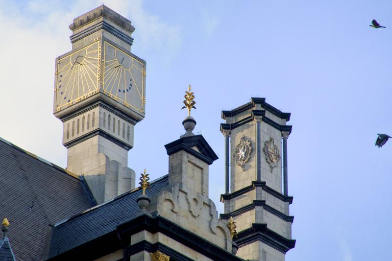The Ghent Town Hall (Stadhuis) has a more intricate sundial, featuring a cube above the rooftop with two sundials to account for different orientations of the sun.