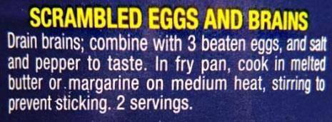 Pork Brains in Milk Gravy is irresistible for its cholesterol content alone (over 1100% of the U.S. RDA!). It’s described as a “southern delicacy.” Beware of “delicacies” anywhere in the world. Brains and egg seems to be the serving suggestion. Also note the U.S. flag and the “Made in the USA” underneath it. This shows the U.S. is still a manufacturing powerhouse.